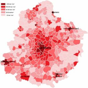 Le département de la Sarthe compte 564 160 habitants en 2025. La répartition de la densité de population au regard de la carte ci-jointe nous révèle une occupation principale selon un axe Nord Est Sud Ouest. Cet axe correspond depuis La Ferté Bernard à l’axe Paris-Nantes par la Flèche ou Paris-Rennes par Sablé sur Sarthe. Ce couloir de peuplement a d’abord suivi la route nationale créée au XIX° siècle et s’est stabilisée aujourd’hui autour de la RD 23. Un autre axe Nord Sud se dessine au départ du Mans, conséquence de la périurbanisation des trente dernières années.
